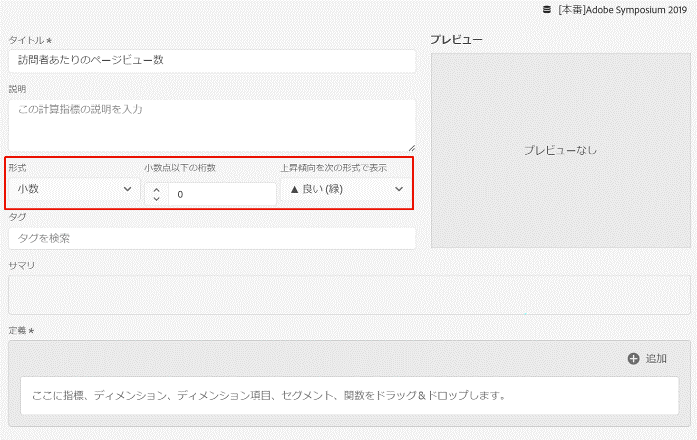 計算指標の表示形式を選択します。この例では、「訪問者あたりのページビュー 数」という数値で表す指標を作成したいので、「形式」のプルダウンから『小数』を選択します。また、「形式」の右隣に「小数点以下の桁数」を指定できるエリアもありますので、作成する指標を整数で表示したい場合はここを『0』に設定します(この例でも0に設定)。