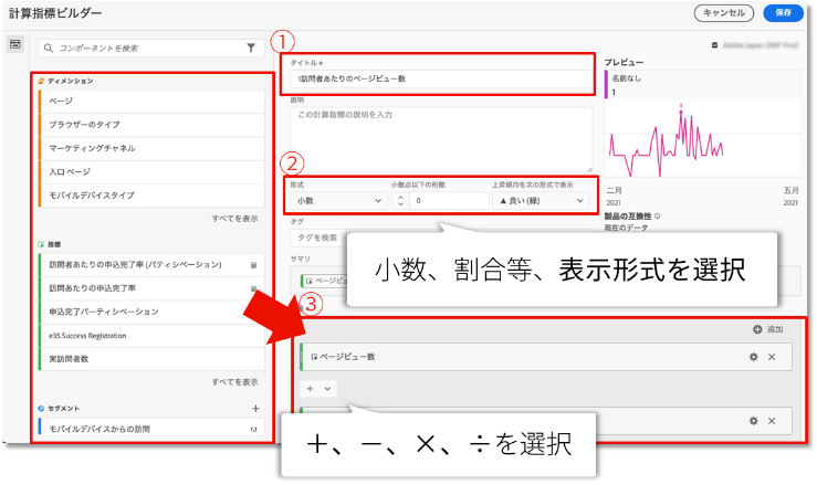 ③コンポーネントエリアから指標をドラッグ&ドロップし、作成する指標の定義を指定します。指標を適用後、各指標の間に演算子(+/ ― / × / ÷ )を選択できるドロップダウンボックスが表示されますので、作りたい指標の定義に沿って任意の演算子を選択します。
