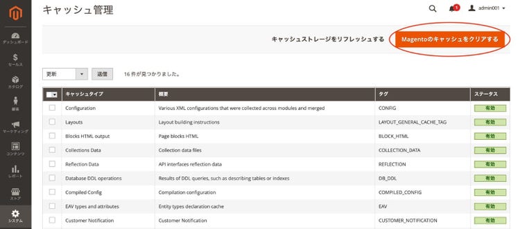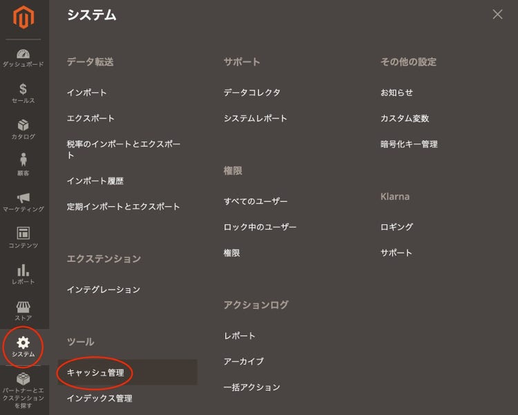 - 画面左のメニューから”システム”を選択し、表示されたメニューから”キャッシュ管理”を選択します。