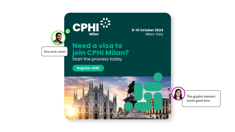 Informaのイベント全体で、キャンペーンのタイムラインが加速しています。例えば、Pharmapackでは、Möller氏とチームがAdobe Expressで様々なテンプレートを作成し、マーケターがソーシャルメディア投稿、フォーマット、スタイルに合わせて調整できるようにしました。マーケターは、デザイナーがブランドの一貫性を確保しながら、チャネル、地域、言語に応じてクリエイティブコンテンツを迅速かつ簡単に変更することができます。