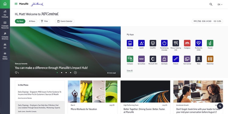 Manulifeの各従業員は、更新されたMFCentralサイトを利用することで、ログインするとすぐに各自の役割や所在地に合わせた情報やサービスにアクセスできるようになりました。フィリピンの従業員は、トロント本社でのイベントに関する更新情報をスクロールすることなく、アジアの金融トレンドに関する記事を読んだり、現地のITチームにリクエストを送信したりすることができます。