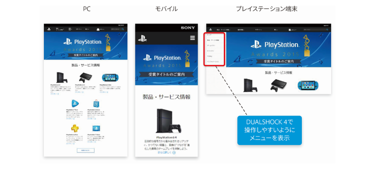 プレイステーション端末向けのページでは、ワイヤレスコントローラー「DUALSHOCK 4」で操作しやすいよう、 メニューを追加表示するといった対応も行われている