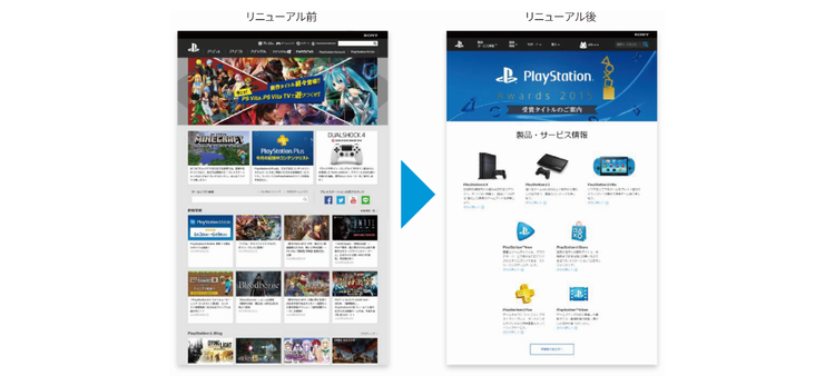「特に大きな成果を得られたケースとして、2015年6月に実施した『プレイステーション』オフィシャルサイトのリニューアルがあります。リニューアルは、総アクセス数のうち、約50%が集中するトップページから着手しました。ユーザーが本当に知りたい情報は何か、どのようなレイアウトが利便性が高いのかといったことを、Adobe Analyticsの分析結果と照らし合わせながらじっくり検討。最終的に、コンテンツ数を絞り込む方向でリニューアルしたところ、ユーザーの満足度を大きく向上させることができたのです」と秋葉氏は話します(図2)。