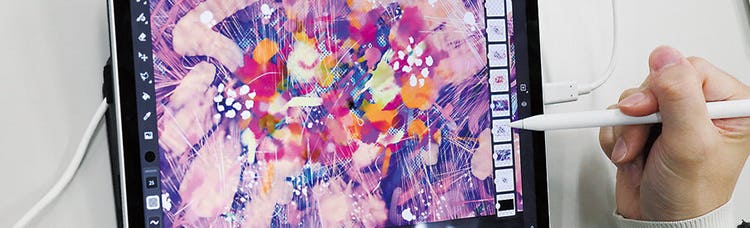「約5分間の演奏中に映像を表現するには、頭の中に描いたイメージを瞬時に表現できなければなりません。リリースされた直後だったiPad上で作動するスケッチ&ペイントアプリAdobe Frescoを試してみると、タイムラグなく反応してスムーズに描けるので、生放送での“ライブ描画”にチャレンジするにはもってこいのツールだと思いました」