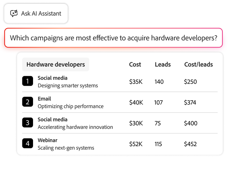 セルフサービス型サポートの改善、コンバージョン低下の阻止、製品主導の成長の促進など、AIを活用したアドビのデータソリューションは、包括的な顧客分析によって、施策につながるインサイトや成果をもたらし、チームを強化します。
