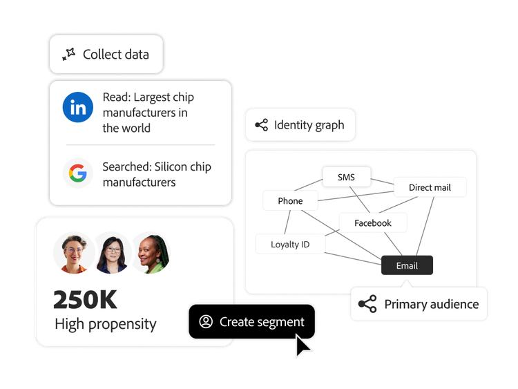 直接的なデータ取り込みやデータウェアハウスとのオーディエンスフェデレーションを使用して、オーディエンスを作成、強化、セグメント化できます。AIを活用したインサイトにより、完全で最新のオーディエンスを構築し、顧客に関連性の高いリアルタイム体験を大規模に提供できます。