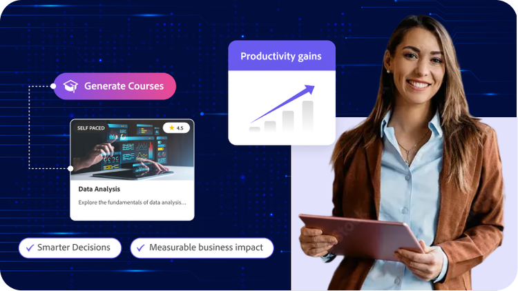 - Adobe의 생성형 AI를 사용해 간단한 텍스트 프롬프트와 전문 지식을 완벽하게 설계된 학습 경험으로 구현합니다.