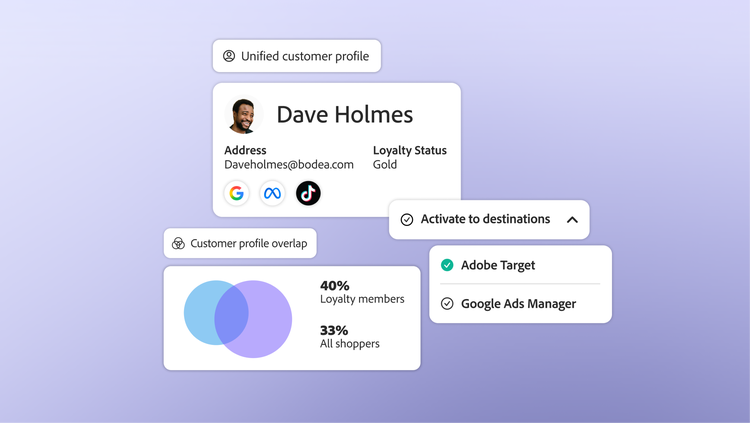 - 제로파티 및 퍼스트파티 데이터. 이벤트 수준의 고객 제공 데이터부터 분석, 설문 조사, 커머스, CRM 데이터까지 다양한 소스에서 직접 데이터를 수집하거나 통합하여 고객에 대한 포괄적인 관점을 확보할 수 있습니다.