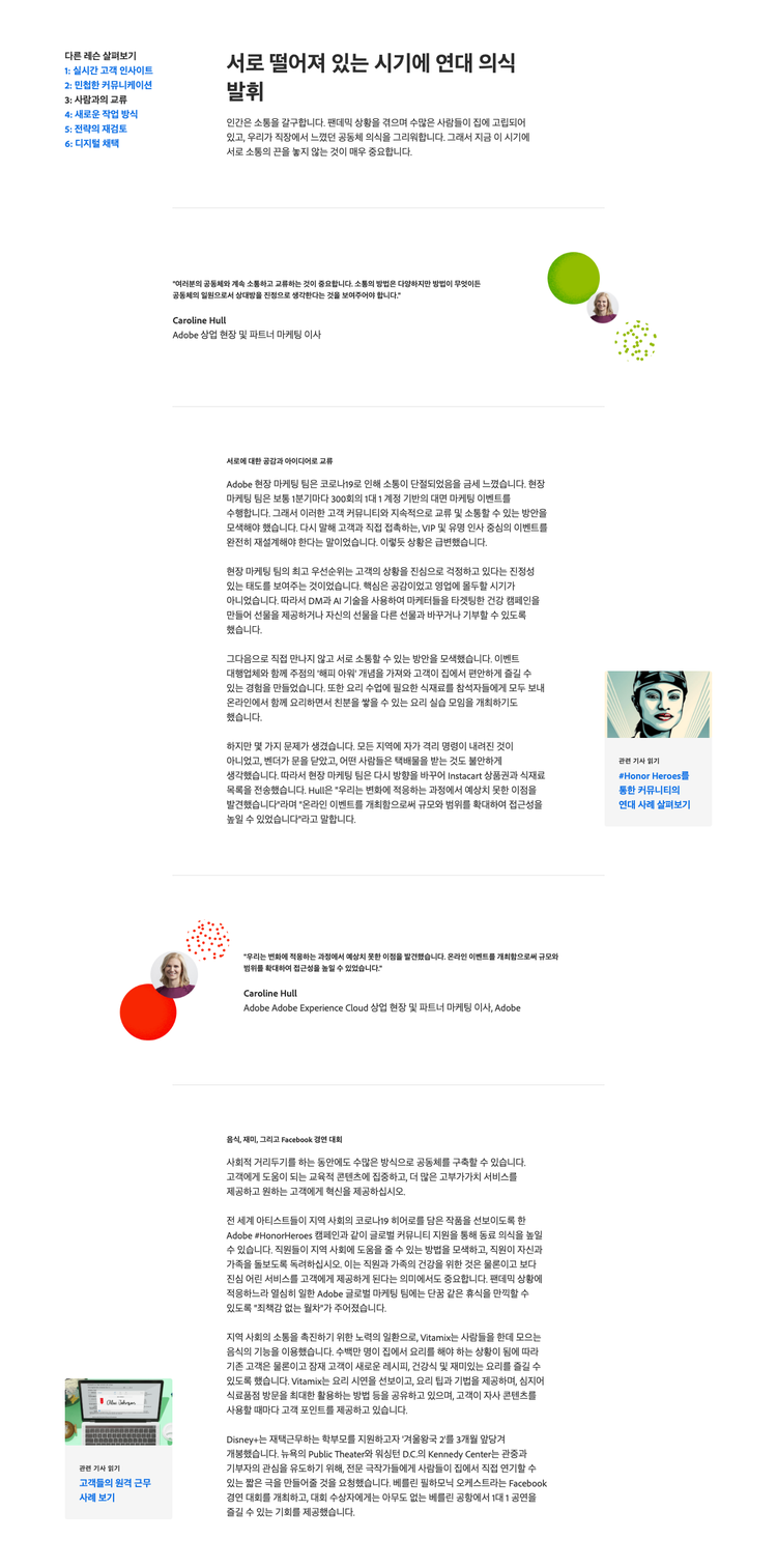 코로나19 팬데믹은 Adobe를 비롯한 모든 비즈니스에 새로운 과제를 던져주었습니다. 6개의 레슨으로 구성된 이 시리즈를 통해 실시간 고객 인사이트의 필요성 등 팬데믹 기간 동안 우리가 얻은 교훈을 모두와 공유하고자 합니다.