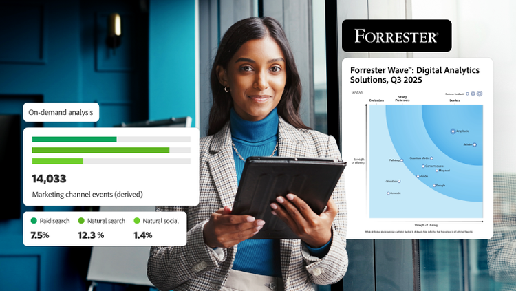 Adobe가 Forrester Wave™: 2025년 3분기 디지털 분석 솔루션 보고서에서 리더로 선정되면서 장기적인 비전과 강력한 역량을 인정받았습니다. 디지털 분석을 기업의 복잡한 니즈를 해결하는 동시에 인사이트를 대중화하는 전사적인 인텔리전스 플랫폼으로 발전시켜온 결과입니다.