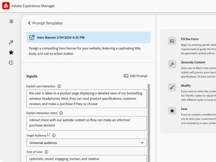 - Optimized prompt templates. Leverage out-of-the-box prompt templates tailored to specific parts of your site to generate better AI outputs and eliminate the need for prompt iterations.