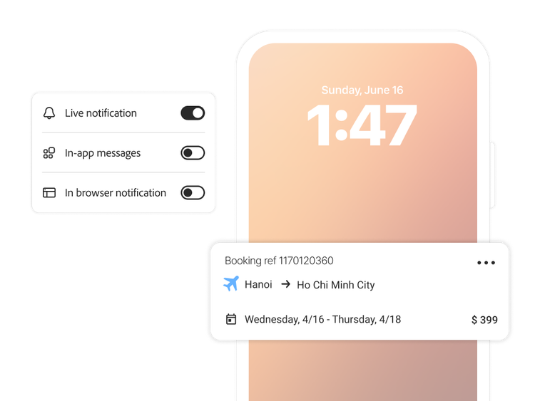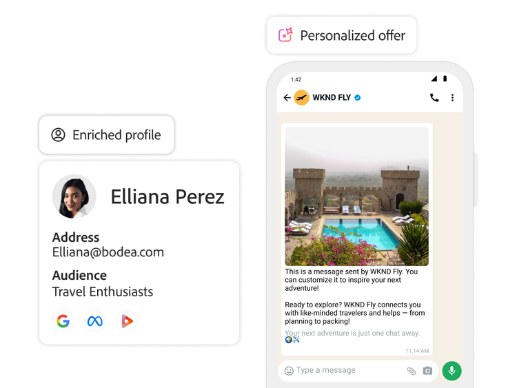 Llega a tus clientes dondequiera que estén con interacciones móviles personalizadas y en tiempo real. Journey Optimizer te permite crear y lanzar experiencias móviles precisas y contextualizadas que abarcan mensajes en la aplicación, notificaciones push, SMS/MMS/RCS, WhatsApp y mucho más.