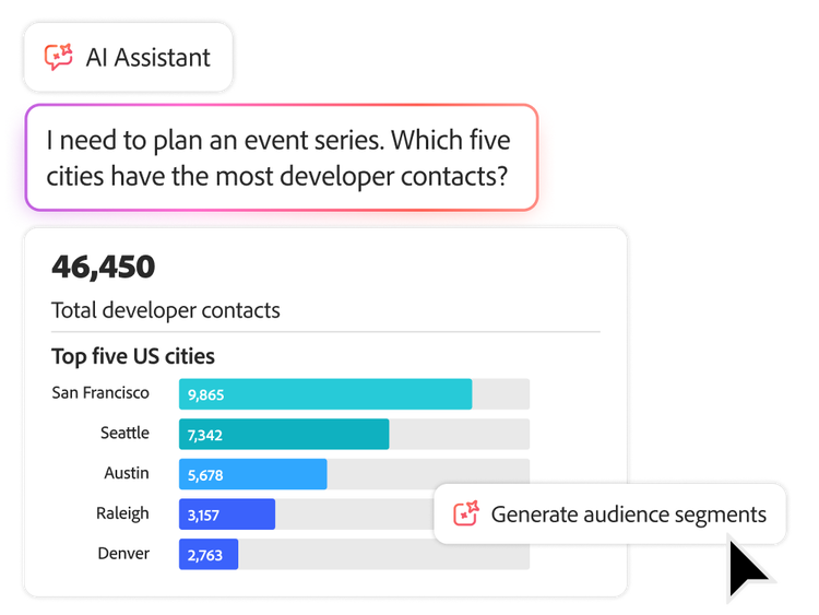 - Verhoog de teamproductiviteit door de AI-assistent doelgroepen, trajecten, analytics-visualisaties en nog veel meer te laten genereren.