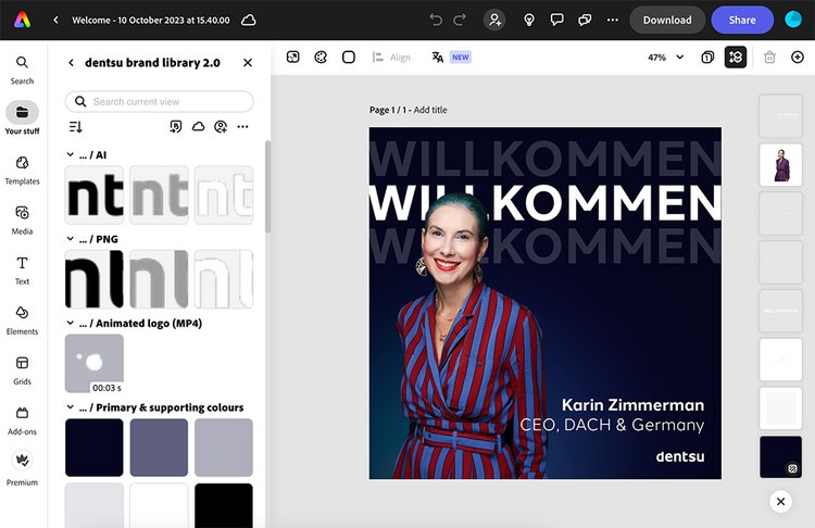 Dentsu recently reinforced its brand by consolidating and reorganizing agencies into six main brands across international markets. As part of this initiative, Martin and her team took a closer look at how they could strengthen branding standards and encourage greater consistency across the agency. Through use of Adobe Creative Cloud Libraries and templates across Creative Cloud apps, designers can quickly find the right colors, fonts, layouts, stock images, and other assets to create on-brand content.