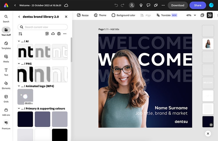 Adobe Express makes it easy for anyone at dentsu to create their own visual assets, from static graphics to animations and video. Designers create branded templates for different types of content that marketers may need, from YouTube video thumbnails to profiles introducing new hires. Marketers can then use the online app to pull up the template and change out images and text as needed. The templates are stored in libraries along with other branded content, including thousands of approved images pulled from Adobe Stock, allowing marketers to deliver the same consistent, branded content as designers.