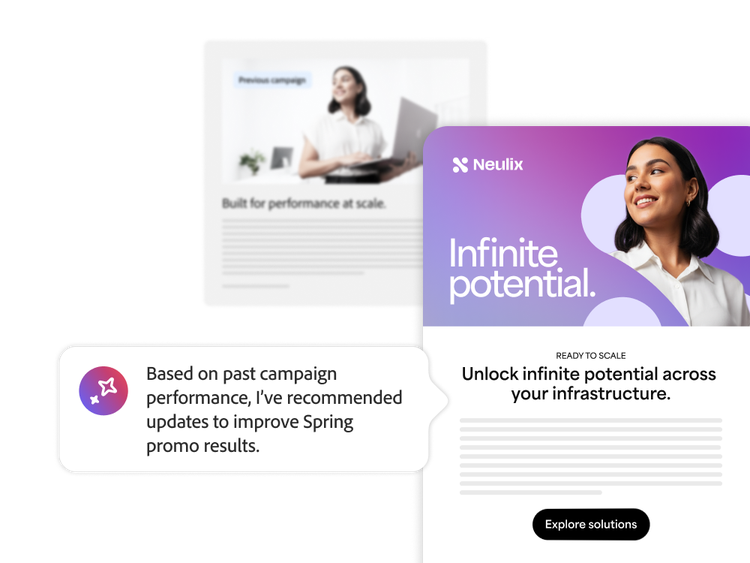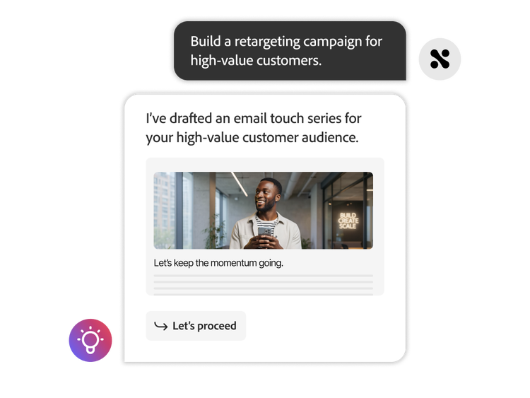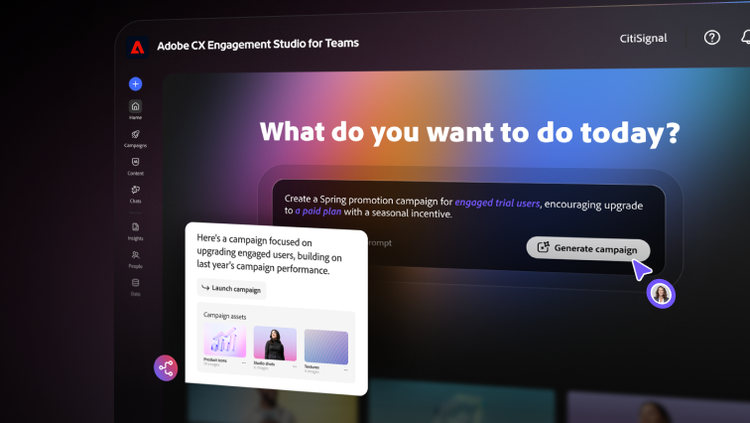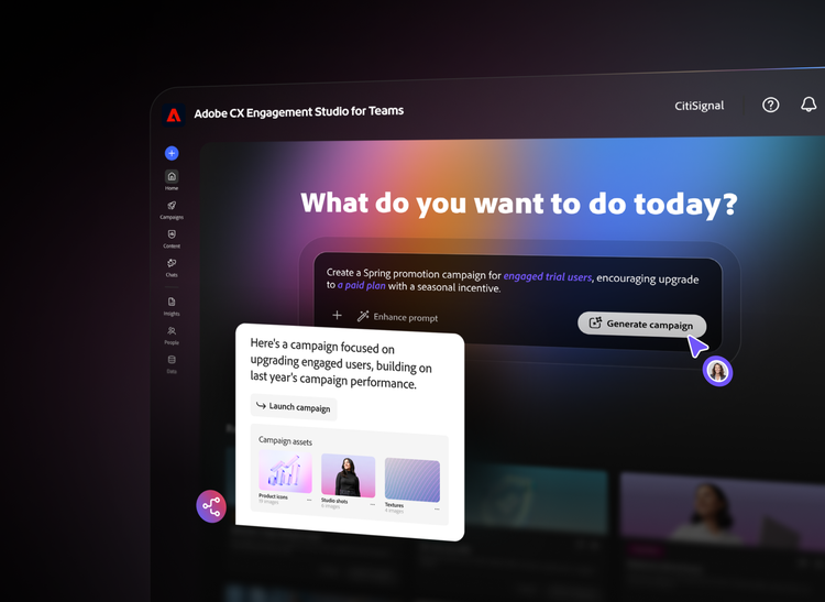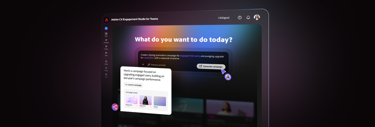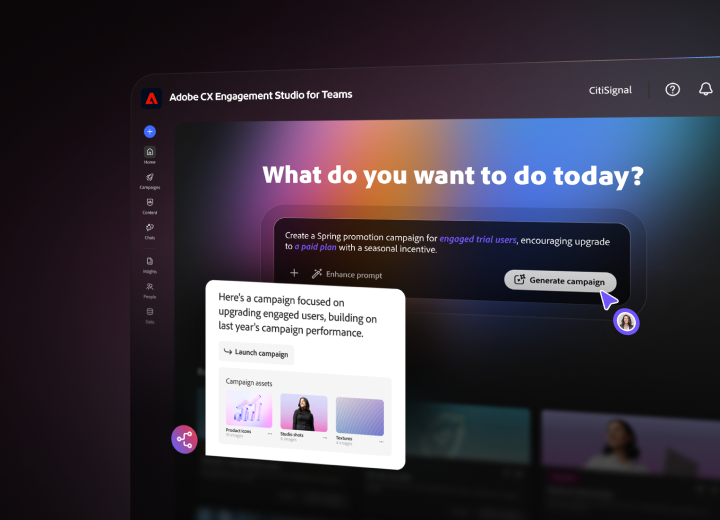 Build audiences, apply brand standards, and generate ready-to-send campaigns in minutes — powered by Adobe CX Engagement Studio for Teams.