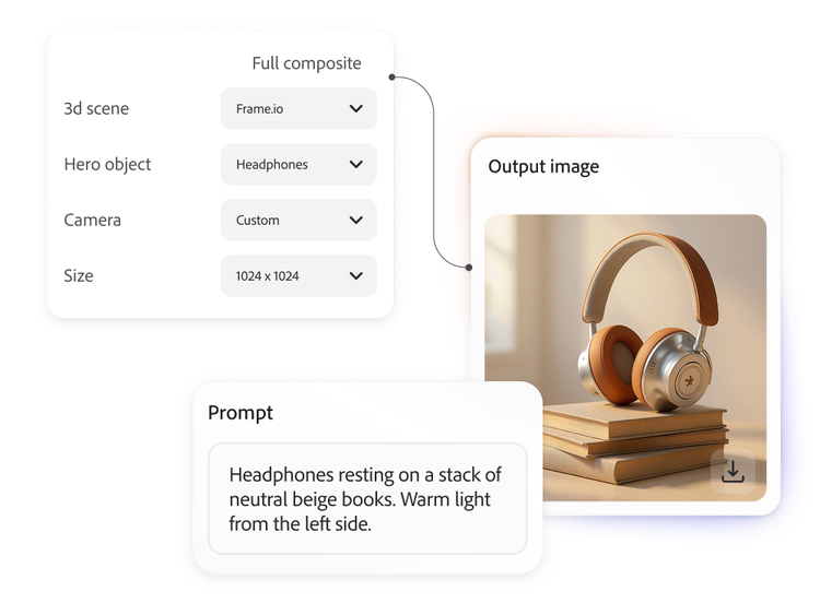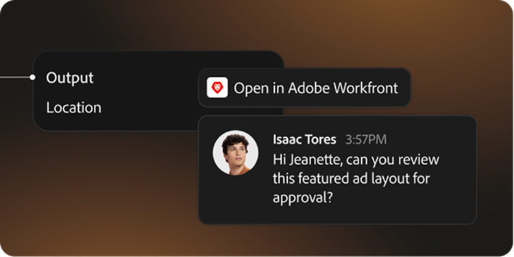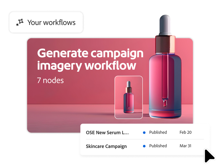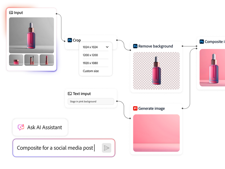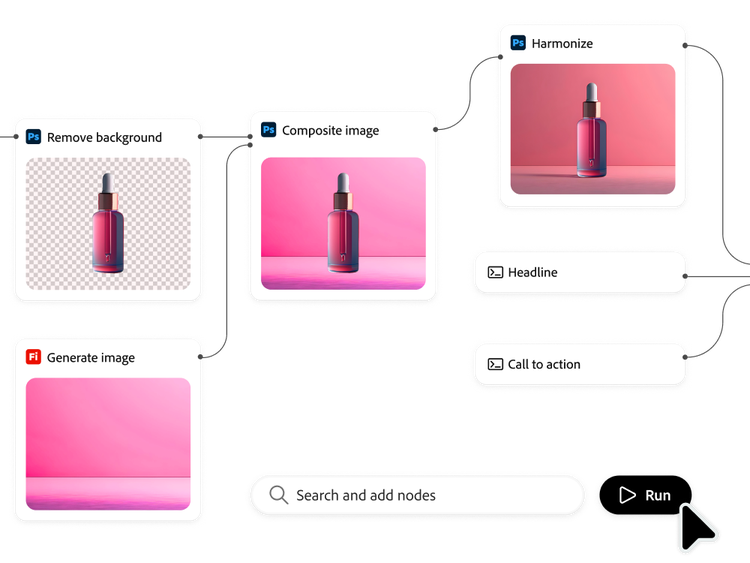 With this product, workflows can be built and run visually with the built-in guided UX and with assistance from an AI agent. Firefly Creative Production provides a drag-and-drop workflow interface that's accessible to creative teams. They can configure content workflows visually by choosing actions such as asset generation, background removal, or routing for review and connecting them in a canvas.