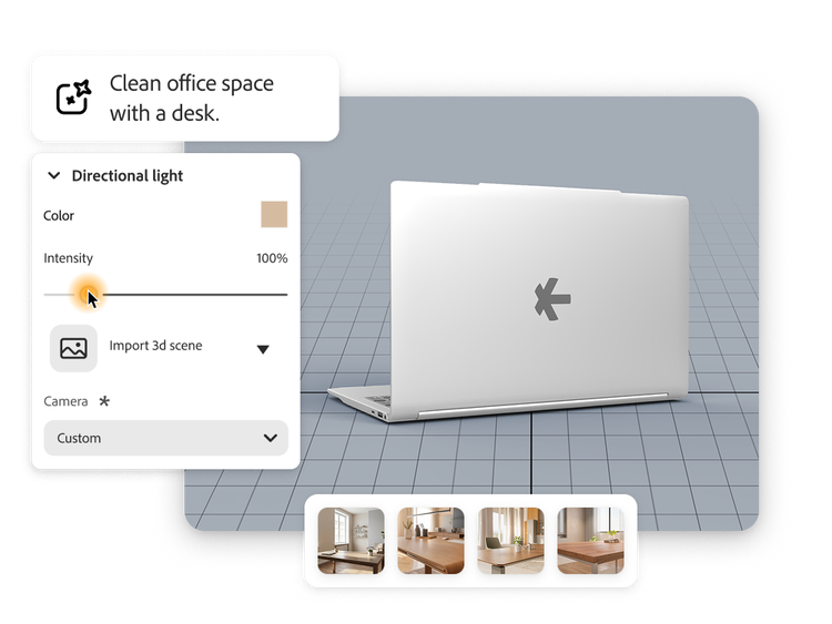 Compositing digital twins into Firefly-generated scenes, while preserving accurate lighting, shadows, and refractions.