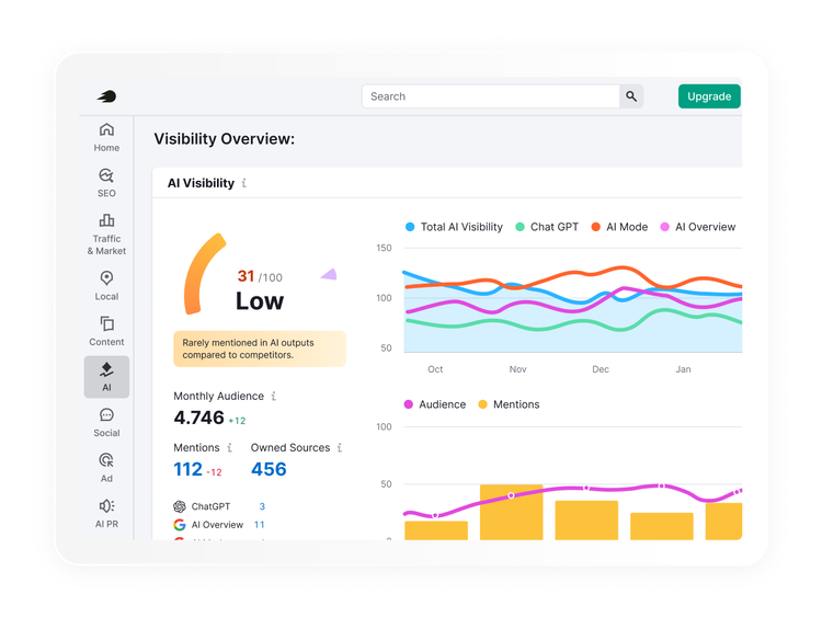 Rank high and show up everywhere buyers search. Find high-value topics, fix technical issues, get mentions, and track how your brand appears across Google and AI platforms.