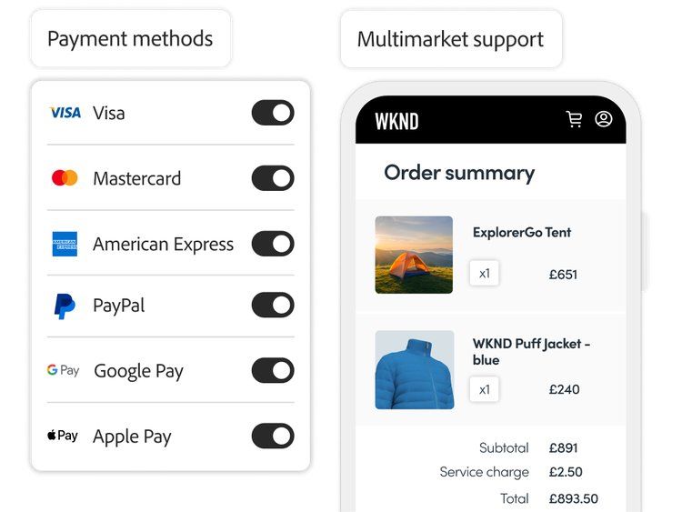 Os serviços de pagamento permitem que você aceite vários métodos de pagamento enquanto gerencia com segurança os dados de transações e de pedidos de cada loja em um só lugar: seu Admin Console da Adobe Commerce.
