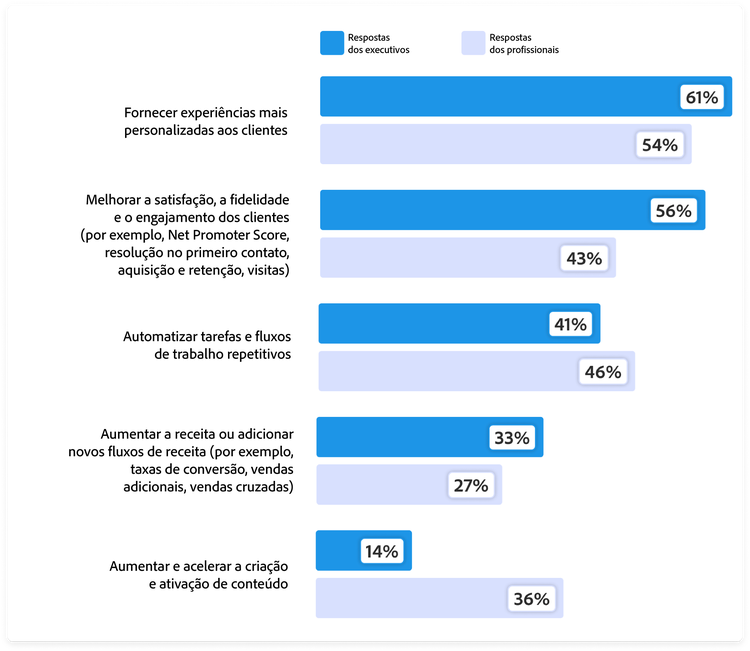 Essas diferenças aparecem na maneira como cada grupo define objetivos para investimentos em IA. Os profissionais têm maior probabilidade que os executivos de focar as realidades operacionais que permitem entregar melhores experiências, como criação de conteúdo e ativação operacional. Os executivos, por sua vez, têm maior probabilidade de enfatizar objetivos como crescimento de receita e satisfação do cliente (Figura 5). Resultados financeiros são prioridade para a maioria dos entrevistados, mas 62% dos executivos consideram métricas como eficiência operacional e economia de custo uma prioridade principal ou muito importante, em comparação com 54% dos profissionais.