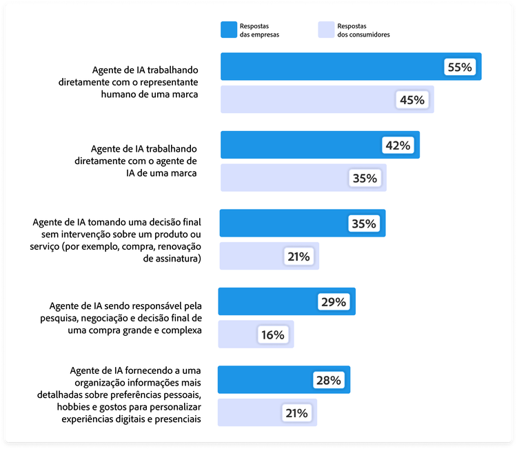 Pergunta para empresas: imagine um futuro em que seus clientes tenham os próprios agentes de IA executando tarefas em nome deles. Você acredita que os clientes da sua organização estariam confortáveis com os seguintes cenários?