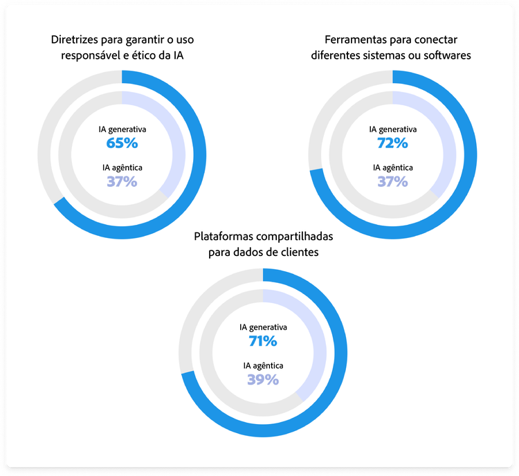 Um grande desafio para as organizações é que a IA agêntica carece da infraestrutura de apoio necessária. Apenas 51% têm tecnologia baseada em nuvem para a IA agêntica, em comparação com 89% que têm a tecnologia para dar suporte à IA generativa. Os investimentos em diretrizes de uso responsável, ferramentas de integração, plataformas de dados em tempo real, processos de gestão de dados e treinamento de funcionários são todos significativamente menores para IA agêntica comparado à IA generativa.