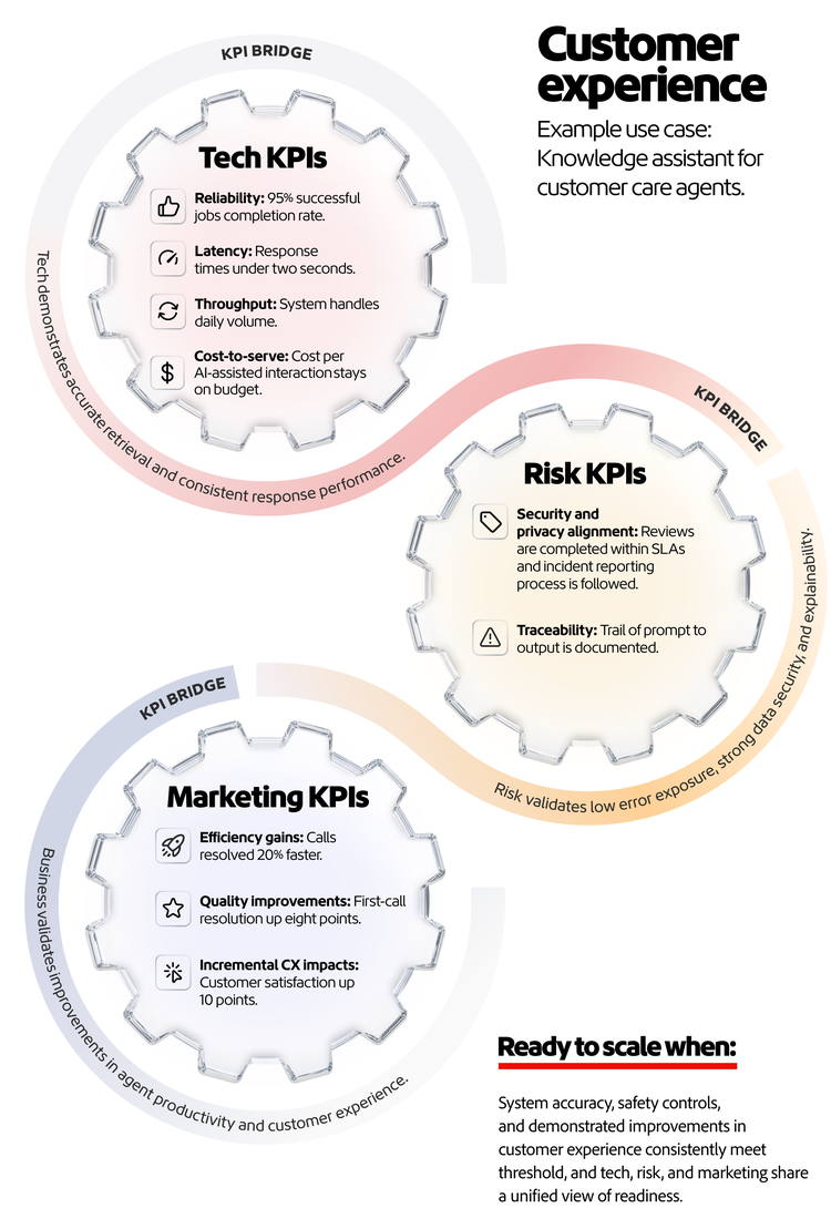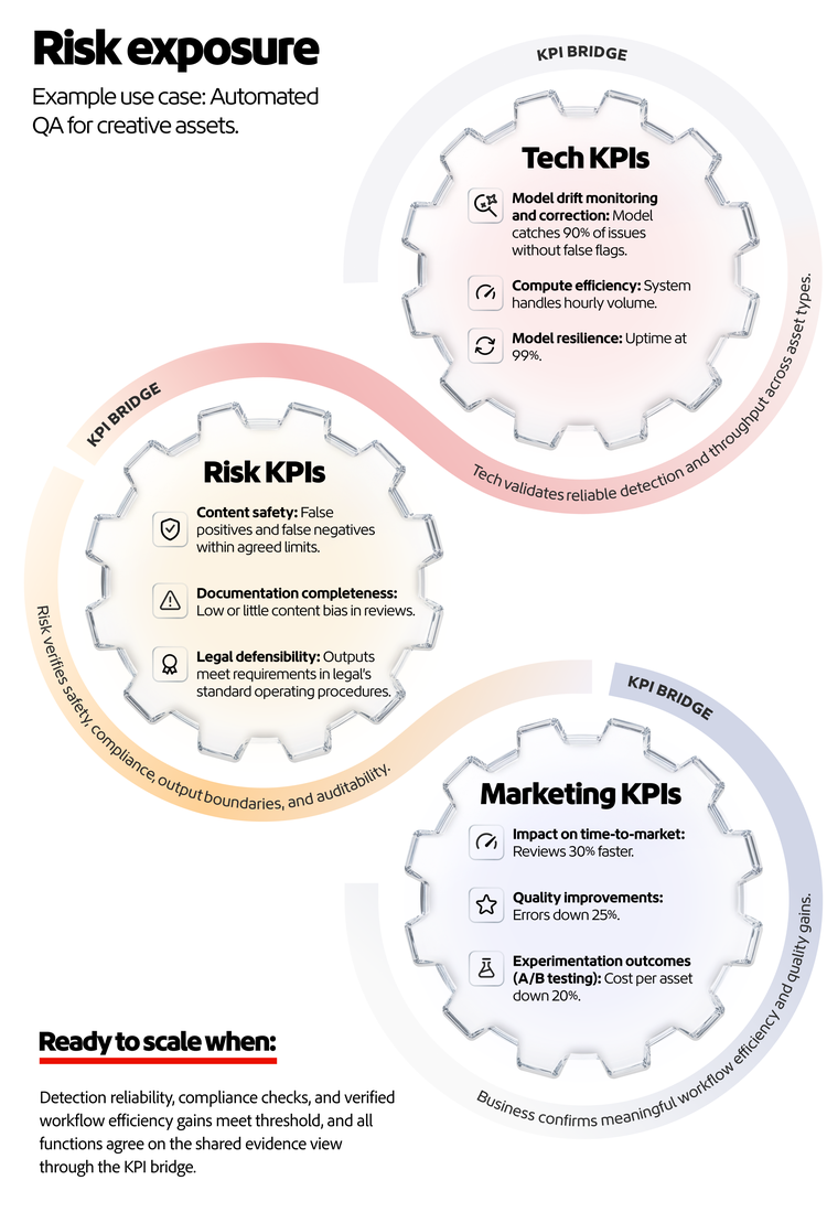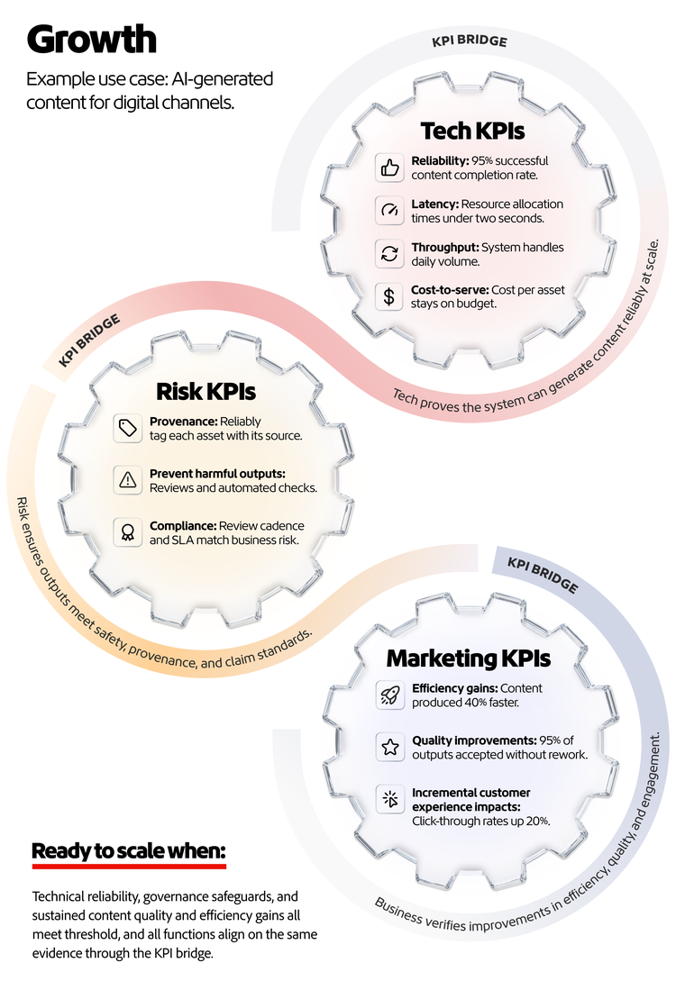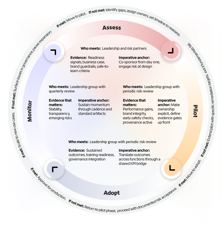 Organizations that scale well intentionally assign ownership, phase by phase. The ones that don’t usually didn't decide against it. Rather, no one is explicitly accountable for the evidence trail (metrics, controls, monitoring) once it crosses from pilot activity into operating capability.