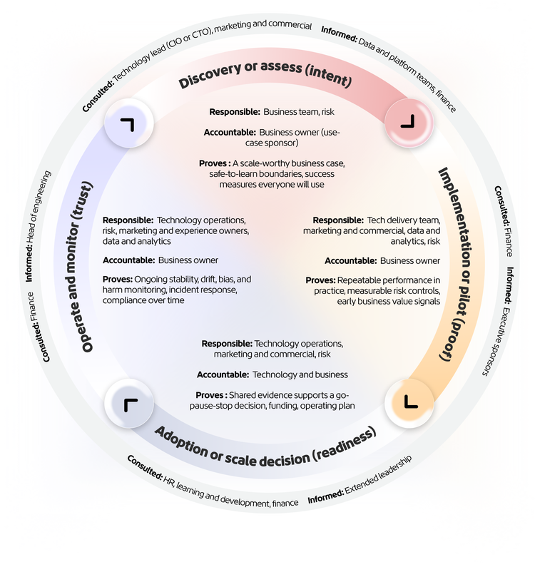 A lifecycle RACI shifts the focus from governance documentation to operational ownership, ensuring accountability doesn’t evaporate when a pilot scales. The table below illustrates how responsibility and accountability should transfer as initiatives move from intent to proof to scale decision to sustained operation, so ownership is designed into the journey, not renegotiated at each checkpoint.