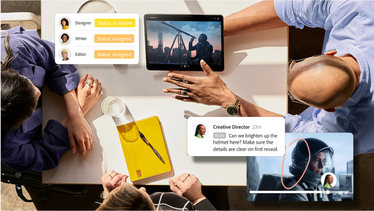 Overhead view of colleagues looking at a tablet, overlayed with collaboration and review software UI from Adobe video production tools.