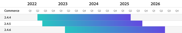 To meet the mission-critical needs of our customers, we are expanding support to provide quality and security patches for three years, starting from the general availability date. The new support term applies to Adobe Commerce 2.4.4 and later releases, as shown in the chart below. For example, version 2.4.5, which was released in August 2022, will receive quality and security support until August 2025. The longer support window recognizes the complexity our customers face operating multiple sites around the globe and enables them to get more value from each deployment. It also frees up resources to focus on adding new functionality or customizing the buying experience to drive faster growth. Beyond the core application, Adobe currently provides PHP support for the same three-year term, giving customers greater control over the timing of their upgrades. More information is available in our revised Adobe Commerce Software Lifecycle Policy.