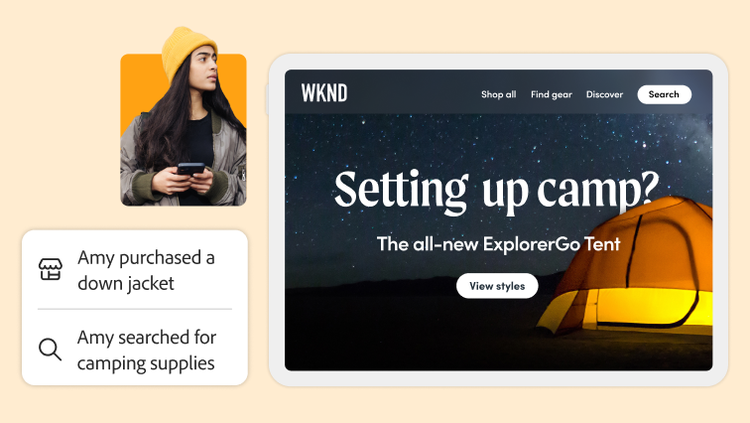 - 動態更新的店面: 透過將內容目標定位到您使用簡單規則定義的客戶細分群體,或向在 Adobe Real-Time CDP 中建立的基於 AI 的客群推送定向內容,從而個人化購物體驗。