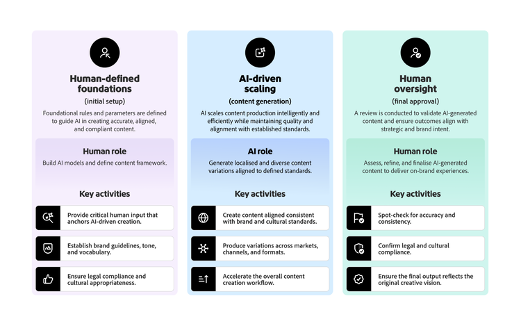 - Humans provide final oversight to ensure quality, compliance, and brand alignment. Asking: “Is this what I was trying to get?” and “Does this comply?”.