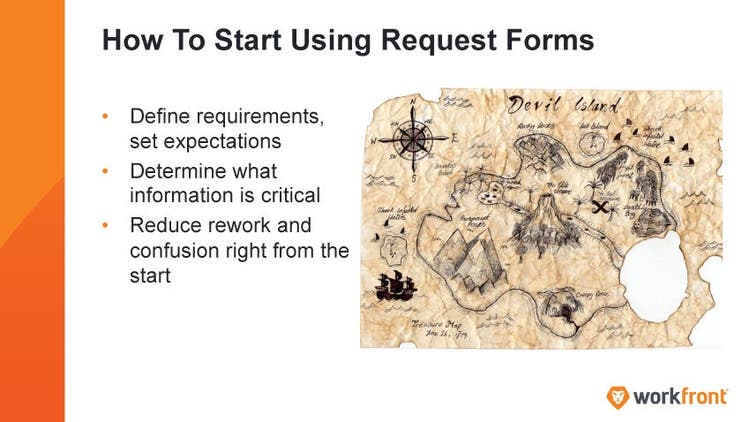 Brent: You may be asking okay, how do I get started? I want to make sure I’m providing the right amount of tools for the people I work with; how do I do this? Realistically, just think of request forms like a map that you’re going to use throughout the work process to make sure you can get to your final destination, whatever that may be or to the treasure; however you choose to think of that.