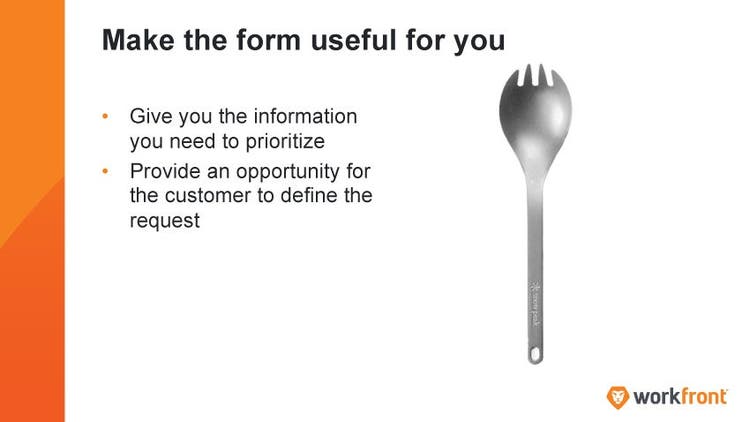 Also, you want to make sure the form is useful for your team; much like the spork pictured here, one of the most useful devices in the world. You want to make sure it gives you the information you need to be able to prioritise better—and that it provides your customer, whether they’re internal or external, the ability to define their requests for you. This way, they’re doing the hard work for you on the front end so you can deliver what they actually want and what they’re actually requesting. Being able to do that with a proper form is a great way to do that.