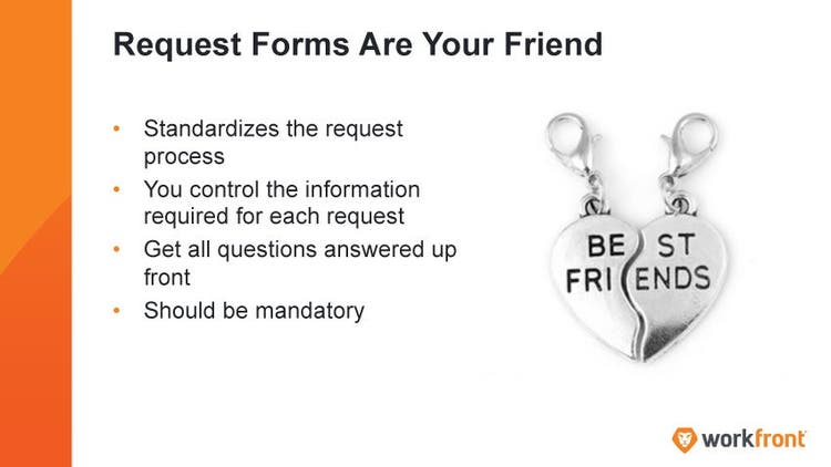 Brent: Our second tip that we’re stealing from project managers is using project request forms. It seems simple enough. The important thing to remember is that request forms can really be your friend. They’re one of the easiest ways to make your intake process a better experience, because you can actually use forms and ask the questions that mean the most to you and your team. They can standardise the process of getting that request into your team.