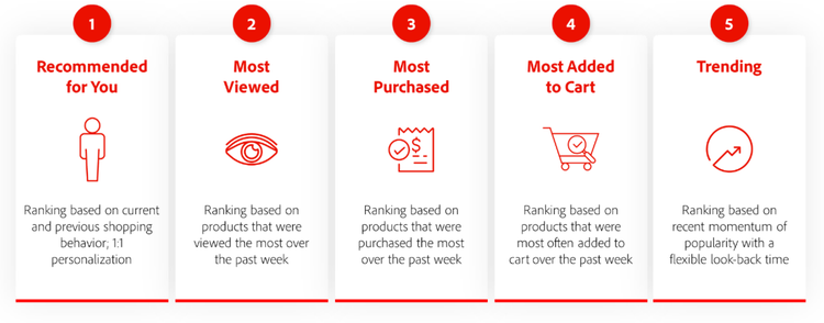 Built within Adobe Commerce Live Search, you can select from a set of five AI re-ranking algorithms, including Recommended for You, Most Viewed, Most Purchased, Most Added to Basket and Trending.