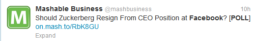 - Polls and Voting: Everyone has an opinion and they usually love sharing it. Try creating a campaign that asks your audience to share their opinion about something. This is a great way to not only create dialogues and engagement, but it also gives you some valuable information about the likes and dislikes of your target audience. Take a look at a recent Mashable poll that was trending on Twitter. I saw a ton of re-tweets in my feed.