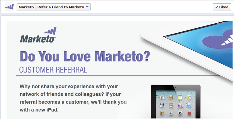 - Refer-a-Friend: These campaigns are always centred around a compelling offer. You can promote your offer via social channels or email marketing. Make sure that you have a special offer for the both sharers and the sharees. For an example of a successful referral campaign, check out Marketo’s recent refer a friend campaign a. If you refer a friend, you get an ipad-which has been proven to be a highly compelling offer.