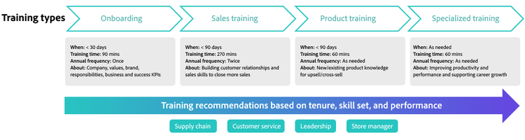 - Job role: For example, sales and product training for shop associates or customer service training for service associates.