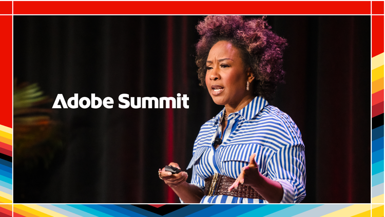 Promotional graphic for Adobe Summit, The Digital Experience Conference, taking place 17-20 March in Las Vegas and online. The image features a speaker, a woman with curly purple hair, wearing a blue and white striped dress, delivering a presentation on stage.