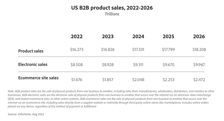 B2B ecommerce is another area of significant growth in online spending. In 2024, US B2B ecommerce sales are forecasted to reach $2.048 trillion dollars — growing at 10.3% year over year.