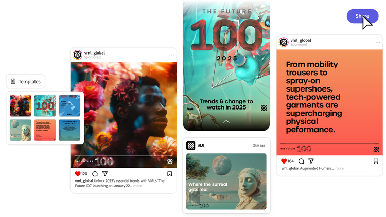 This year, with Adobe Express templates in their toolkit, the VML marcomms team delivered more than 300 posts across global channels in just one week, maintaining a cohesive visual identity while moving at top speed.