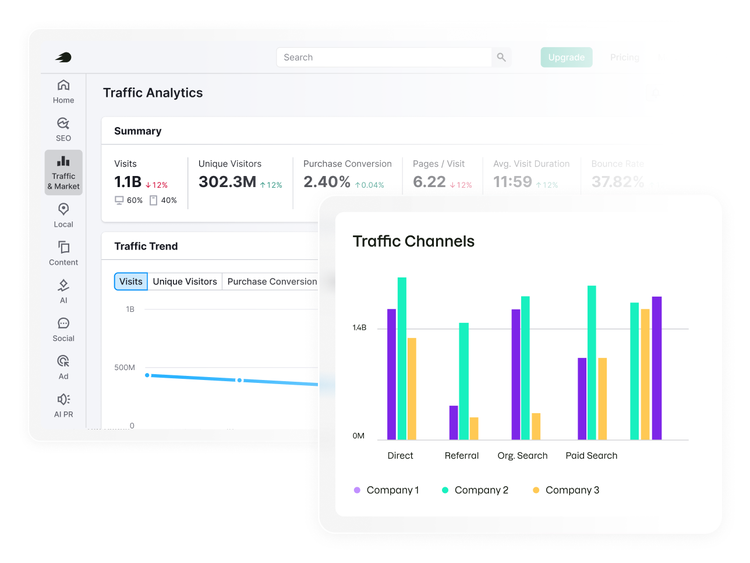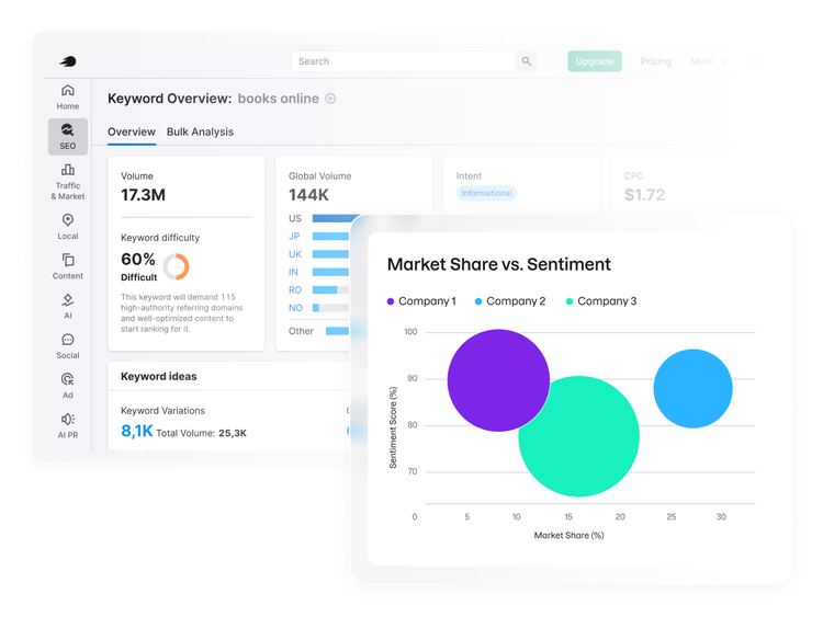 Rank high and show up everywhere buyers search. Find high-value topics, fix technical issues, get mentions and track how your brand appears across Google and AI platforms.